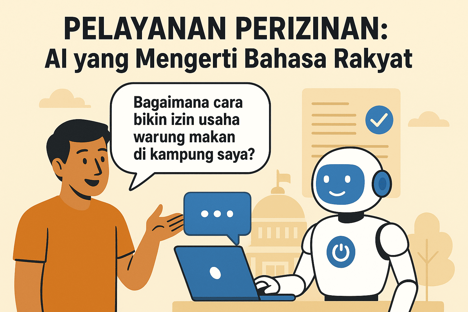 Pelayanan publik, khususnya perizinan, adalah wajah paling nyata dari interaksi antara pemerintah dan warga negara. Proses yang lambat, rumit, dan penuh jargon teknis sering membuat masyarakat enggan mengurus izin resmi, dari sekadar izin usaha kecil, mendirikan bangunan, hingga dokumen legal lainnya. Kehadiran kecerdasan buatan (AI) menawarkan terobosan besar: sebuah sistem perizinan digital yang tidak hanya cepat dan efisien, tetapi juga mampu mengerti bahasa rakyat—bahasa sehari-hari yang sederhana, lugas, dan mudah dipahami. Artikel ini menguraikan bagaimana AI dapat digunakan untuk menghadirkan pelayanan perizinan yang ramah, transparan, sekaligus memperkuat tata kelola pemerintahan digital.