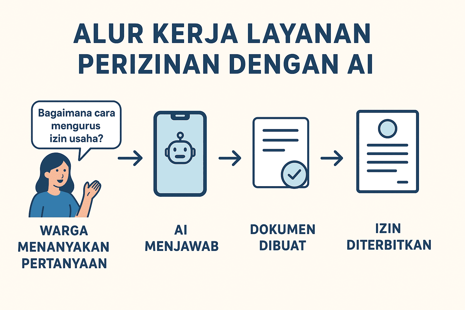 Alur kerja dimulai ketika warga mengajukan pertanyaan melalui kanal digital (aplikasi, WhatsApp, chatbot web, atau kiosk layanan di kantor desa). AI akan menafsirkan maksud pertanyaan, lalu mencocokkannya dengan basis aturan. Hasilnya berupa jawaban yang terdiri dari: dokumen yang perlu disiapkan, estimasi biaya resmi, waktu proses, serta tautan langsung ke formulir online. Jika warga kesulitan, AI dapat membimbing langkah demi langkah, misalnya dengan wizard interaktif. Hasil permohonan izin yang sudah lengkap otomatis masuk ke sistem manajemen perizinan pemerintah untuk diverifikasi petugas.