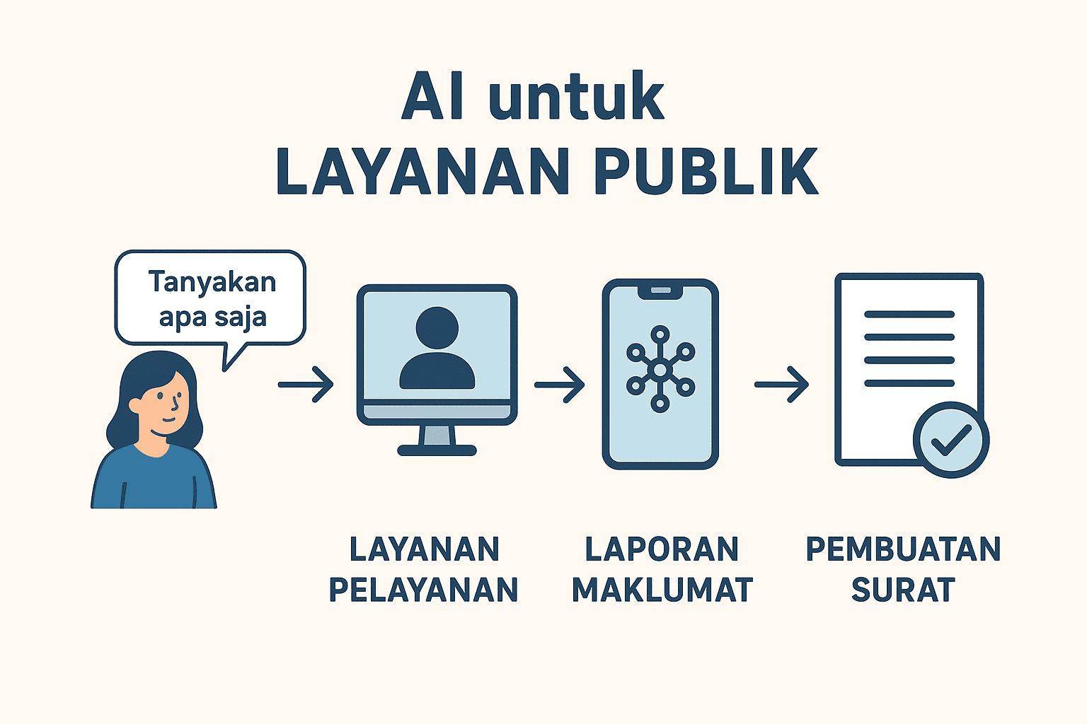 Agar AI mampu menjawab dengan benar, dibutuhkan basis data yang terintegrasi. Sumber utamanya mencakup peraturan perundangan, prosedur operasional standar (SOP), Frequently Asked Questions (FAQ) layanan perizinan, serta arsip interaksi layanan publik sebelumnya. Data ini diolah menjadi knowledge base yang terstruktur. Integrasi dengan sistem back-office pemerintah juga penting, sehingga jawaban yang diberikan AI tidak hanya informatif, tetapi juga operasional—misalnya, langsung mengarahkan ke formulir digital yang relevan.